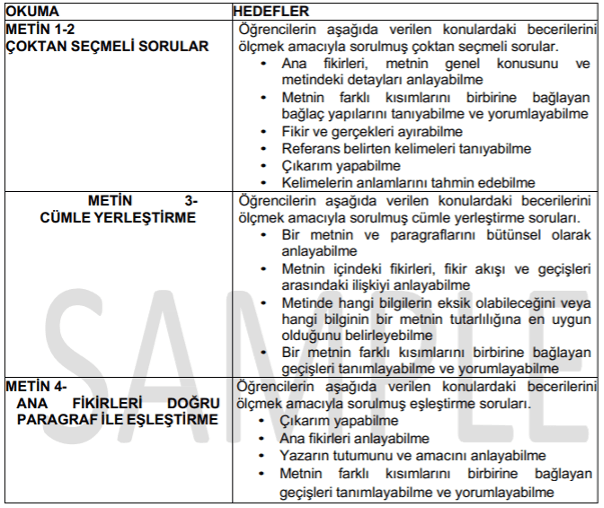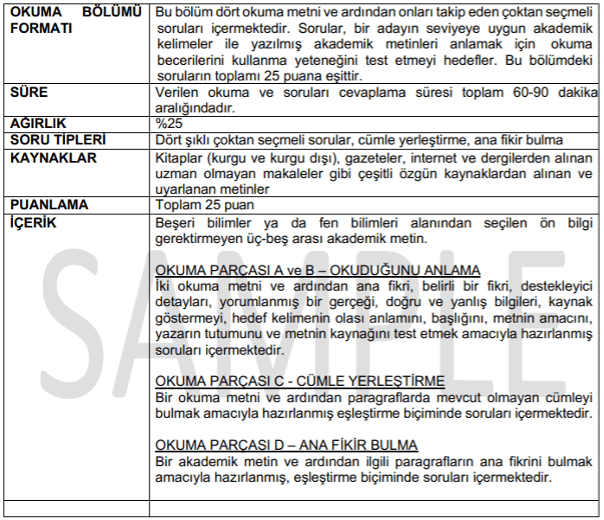 Akademik metinler üzerinden akademik kelimeleri anlama becerisini test eden en fazla 25 çoktan seçmeli sorudan oluşur.