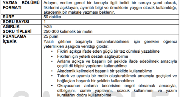 Genel bir tartışma konusunda akademik bir makale yazma becerisini ölçer.