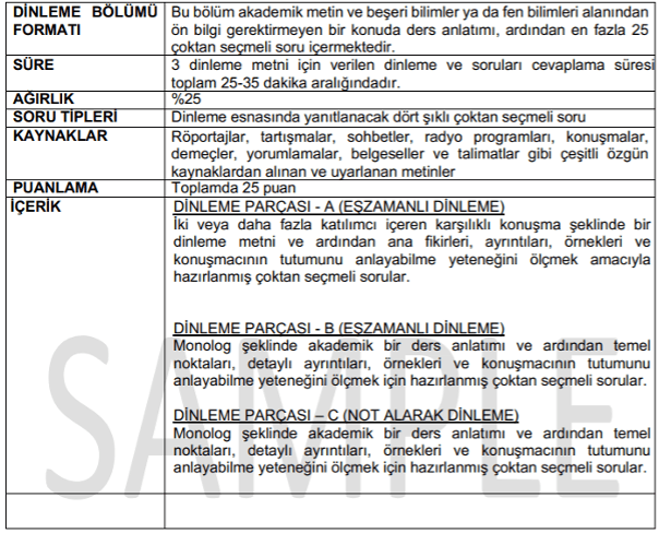 Akademik metinler üzerinden akademik dinleme becerilerini test eden en fazla 25 çoktan seçmeli sorudan oluşur.