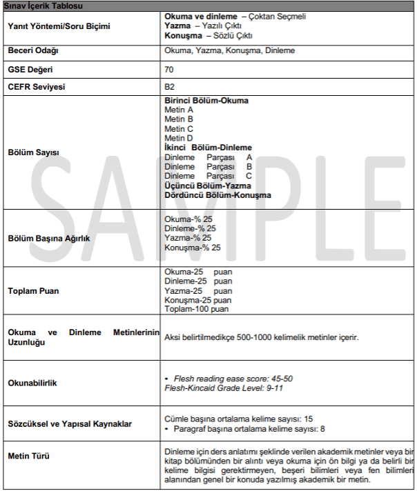 TEDÜ İYS, öğrencilerin akademik İngilizce becerilerini değerlendirmek için aşağıdaki bölümleri içerir: